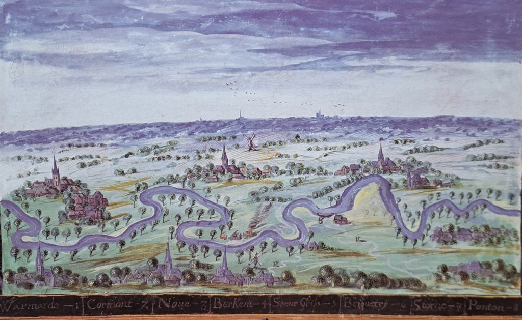 Wij vermoeden dat de schilder, Adriaan van Montigny, zich op de flank van de Waaienberg bevond om dit uitzicht op de Scheldevallei vast te leggen. Onderaan de afbeelding vindt men een legendebalk met in het rood aangegeven cijfers: Warmaarde (1), Cormont (Kwaremont) (2), Nove (Ten Hove) (3), Berkem (Berchem) (4), Soeur Grise (klooster) (5), Briquetry (steenbakkerij) (6), Storne (7) en Ponton (8).