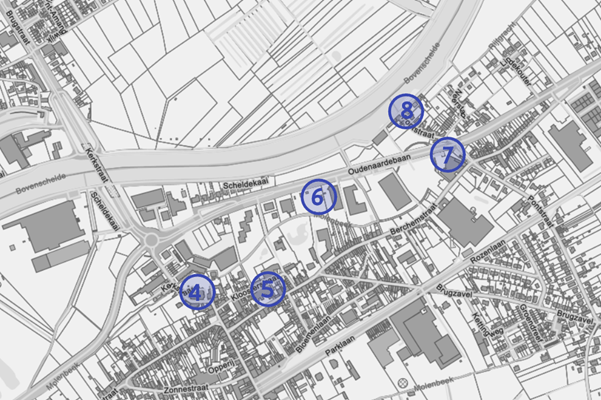 Ter verduidelijking volgen enkele klassieke kaartfragmenten waarop de cijfers uit de legende van het Album De Croÿ terug te vinden zijn. Het eerste fragment, afkomstig van de Villaretkaart, toont een loop van de Schelde die duidelijk overeenkomt met het perspectief in het album; het laatste fragment plaatst dezelfde punten op een hedendaagse kaart.
